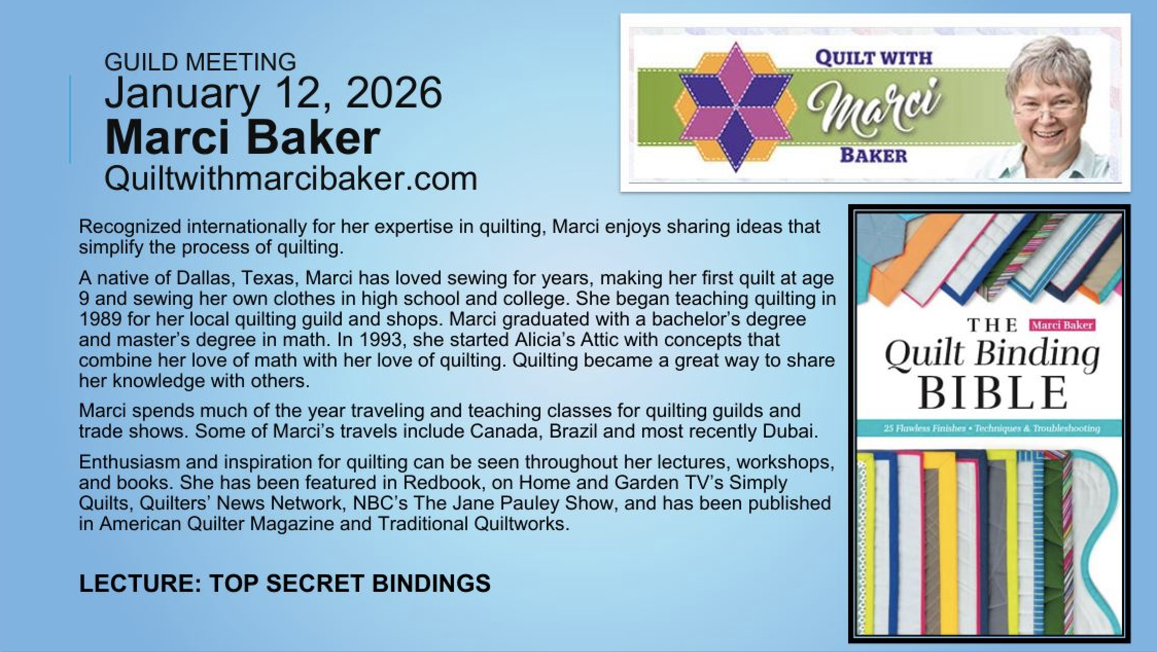 The Program portion of the January Monthly Guild Meeting featuring Marci Baker is available via Zoom, please click on the Register for Zoom button below to register for the meeting and you will receive an email with the Zoom Link. Marci will be live from approximately 7:30pm-8:30pm EST on Monday, January 12th.